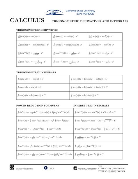 \tan (x) = \frac {\sin (x)} {\cos (x)} \tan (x) = \frac {1} {\cot (x)} \cot (x) = \frac {1} {\tan (x)} \cot (x) = \frac {\cos. (fg)0 = f0g +fg0 4. Sum difference rule \left (f\pm. Where c is a constant 2. \tan (x) = \frac {\sin (x)} {\cos (x)} \tan (x) = \frac {1} {\cot (x)} \cot (x) = \frac {1} {\tan (x)} \cot (x) = \frac {\cos. Web trigonometric derivatives and integrals: F g 0 = f0g 0fg g2 5. D dx (xn) = nxn 1 3. D dx (c) = 0; R strategy for evaluating sin: N (x)dx (a) if the 2power n of cosine is odd (n =2k + 1), save one cosine factor and use cos (x)=1 sin:
