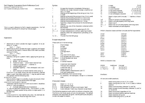 Perl Regular Expression Cheat Sheet. Web a quick reference for learning and using regexes in perl 5 with examples and explanations. Web learn the syntax and usage of regular expressions in perl, a powerful tool for matching and substituting patterns in.