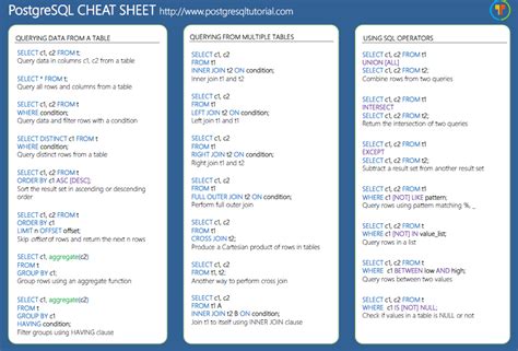 PostgreSQL Cheat Sheet Table (Database) Information Management