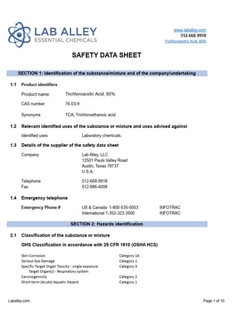 Trichloroacetic Acid Safety Data Sheet. Web safety data sheet trichloroacetic acid revision date 1/1/2020 1. 02.11.2015 page 3 of 7.